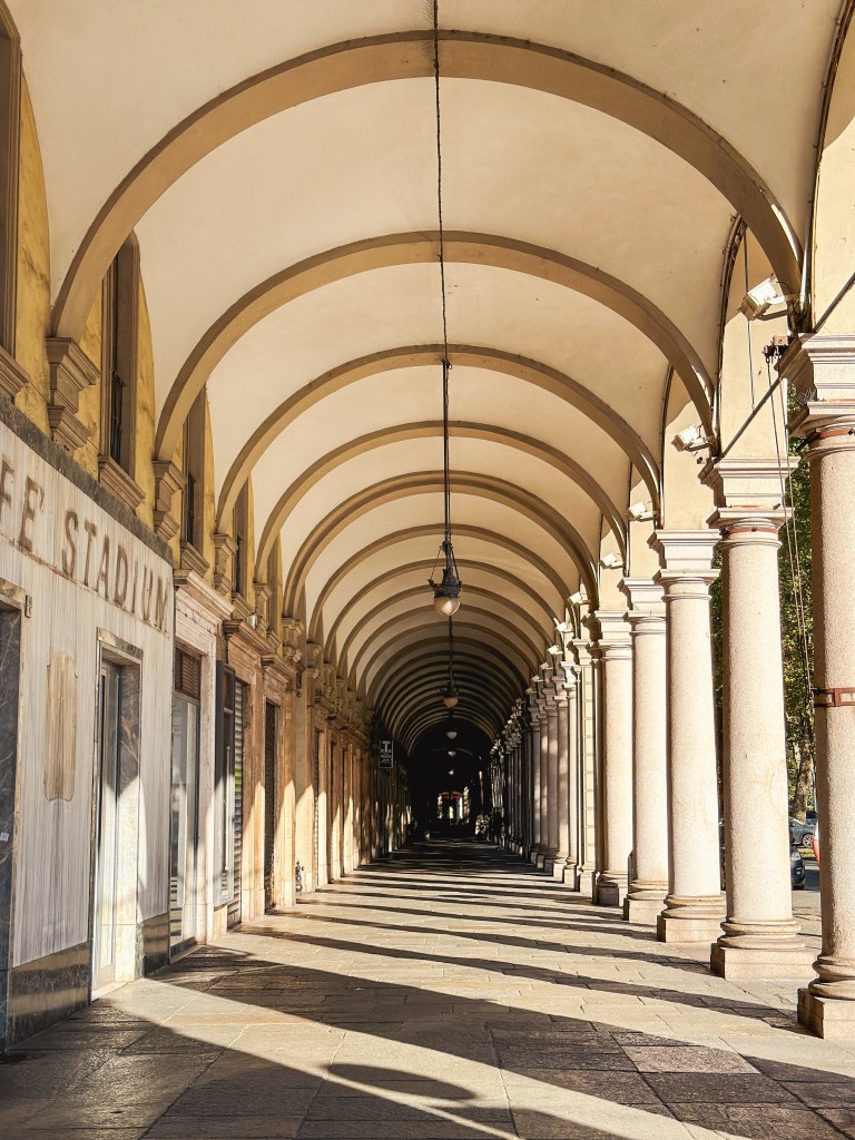 - Plaza de Vittorio Veneto: lo cierto es que me habían dicho que era la más grande de Italia… simplemente se olvidaron de decir era la ‘plaza porticada’ más grande de Italia.